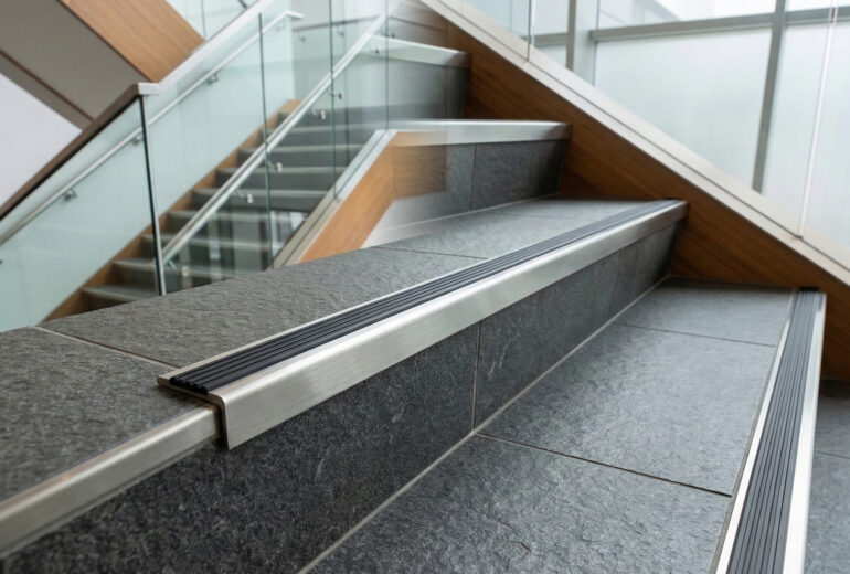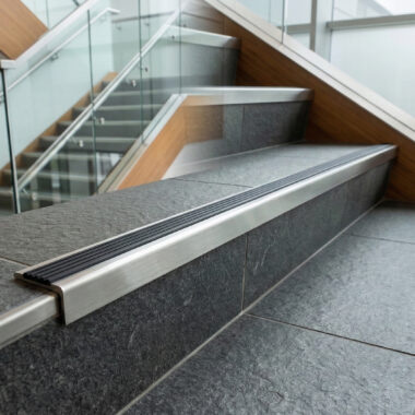 ホテルなど贅沢な空間では、床材もカーペットが使用されるなど階段もより一層華やかにされています。摩耗や捲れからカーペットを保護しながら、黄銅色の輝きで階段をより一層華やかにする真鍮製ノンスリップ(階段滑り止め)の輝きを見ていただきました