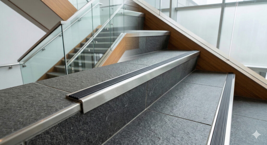 これにより、公共階段のように日常的に靴底摩耗や清掃を受ける環境でも、ノンスリップの見付部の光沢と端部のエッジラインが長期にわたり保持されます。